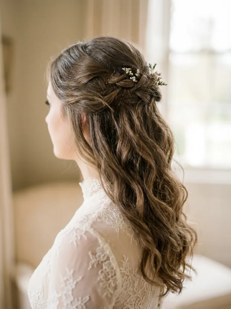 Half up half down wedding styles give you flexibility without sacrificing structure. They allow your hair to move naturally while still feeling styled and secure.